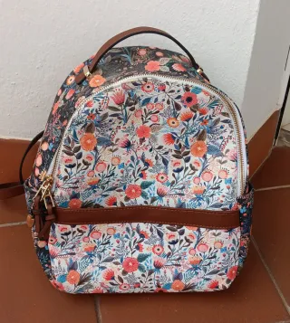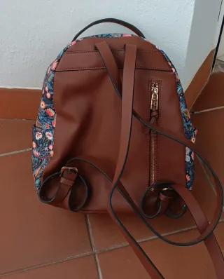 Mochila con un bonito estampado floral. Ideal para el día a día. - Diseño con flores en tonos marrones y multicolor. - Asa superior y correas ajustables. - Bolsillos exteriores.