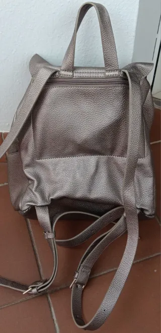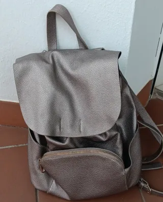 Mochila con un diseño moderno y acabado metalizado. - Material con textura efecto piel. - Cierre principal con cordón y solapa. - Bolsillo frontal con cremallera.