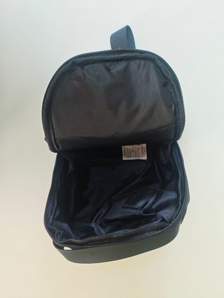 Este neceser o mochila es un accesorio versátil y moderno. - Diseño moderno con pliegues. - Espacio principal con cremallera y bolsillo exterior cerrado con cremallera también. - Material: Piel sintética, suave al tacto. - Medidas: 30 cm x 20 cm x 8cm No se ha usado ninguna vez.