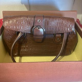 Elegante bolso con acabado que imita la piel de cocodrilo. Se encuentra en perfecto estado. - Diseño con solapa y hebilla metálica. - Asas de mano. - Textura marcada y detallada.