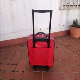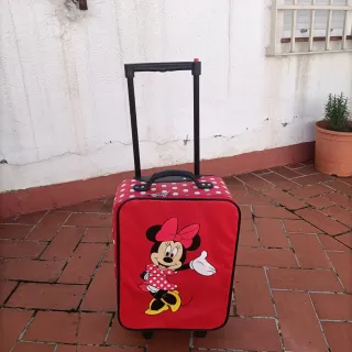 Maleta infantil con el diseño de Minnie Mouse. - Color rojo con lunares blancos. - Personaje de Disney. - Ruedas para facilitar el transporte. -Bolsillo interior para guardar cosas y gomas elásticas para que la ropa no se mueva. -Se regala mochila de Minnie Mouse a juego y Bolsa mochila.