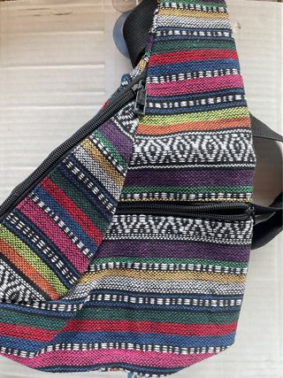 Mochila cruzada con un diseño vibrante y llamativo. - Tejido con estampado de rayas y motivos geométricos. - Cierre de cremallera principal. - Bolsillo frontal con cremallera.