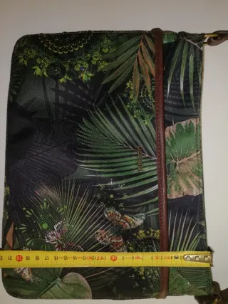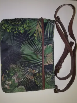 Bolso con un llamativo estampado de selva tropical, lleno de hojas verdes y mariposas. - Diseño con temática de naturaleza. - Correa ajustable para llevar al hombro o cruzado.