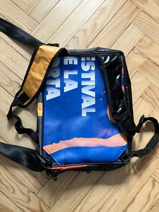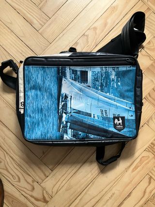 Mochila bandolera con un diseño gráfico llamativo de material totalmente reciclado. Nunca se ha usado. Tambien funciona como mochila de espalda - Estampado de velero y agua. - Cierre de cremallera. - Correa ajustable.