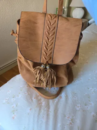 Mochila de cuero en color camel, con un diseño único. - Detalle de trenzado en la solapa. - Adornos de flecos y abalorios. - Asa superior y correas ajustables.