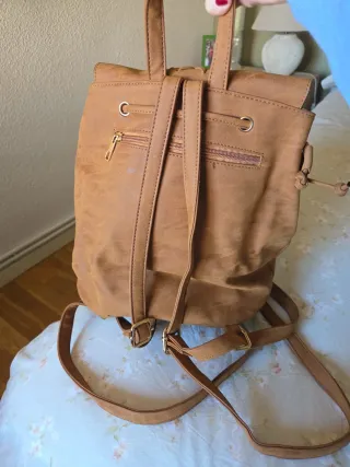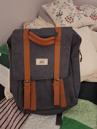 Mochila de estilo vaquero, con tejido lavado a la piedra ,con divertidos parches. Bolsillo lateral para botella y amplio bolsillo frontal. Gran capacidad. Nueva, en perfecto estado