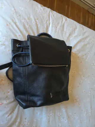 Mochila de piel en color negro. - Cierre de cremallera. - Asa superior trenzada. - Detalle metálico frontal.