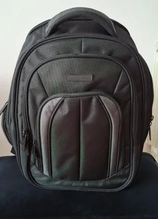 Mochila para portátil de la marca Perry Ellis. - Compartimento principal espacioso. - Bolsillo frontal con organizador. - Correas acolchadas ajustables. - Asa superior reforzada. - Diseño moderno en negro y gris.