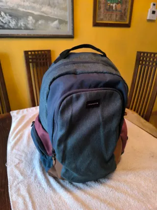 Mochila Quiksilver en buen estado, ideal para el día a día. Su diseño combina tonos azules, marrones y burdeos. - Compartimento principal espacioso. - Bolsillo frontal con cremallera. - Asas acolchadas ajustables.