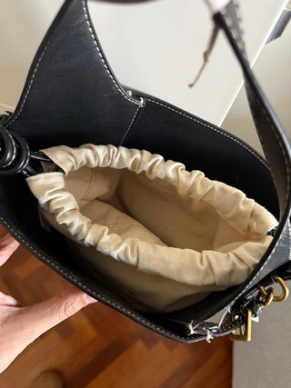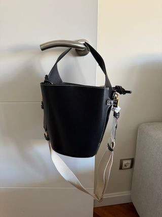 Bolso tipo bucket de Zara con pespuntes. - Color negro. - Asa corta y correa larga ajustable. - Cierre con cordón y detalle de nudo.