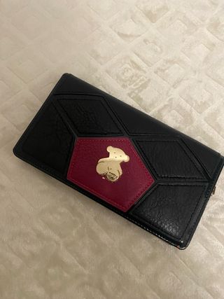 Elegante cartera Tous con un diseño moderno y llamativo. - Combinación de colores negro y rojo. - Detalle de osito Tous en dorado.