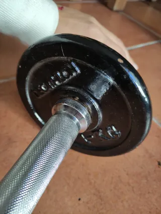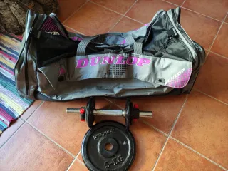 Conjunto de bolsa de deporte dunlop en buen estado y mancuerna con dos discos de 0.5 y 1kg. Aparte otro disco de 5kg. Posibilidad de entrega en Madrid zona Embajadores, Majadahonda, la Adrada o san Martín de Valdeiglesias.