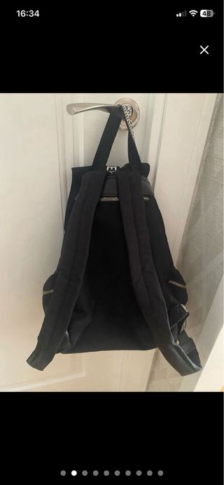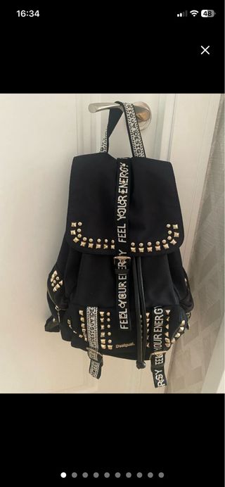 Mochila marca original Desigual negra con tachuelas doradas en perfecto estado por poco uso - Gran capacidad 40x30x15 - Cierre principal con cordón y solapa.