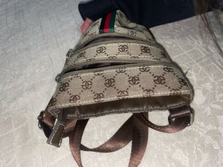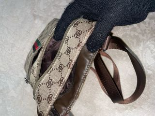 Riñonera con un diseño distintivo y práctico. - Estampado de monograma. - Tira de cinta con detalles de rayas verdes y rojas. - Cierre de cremallera. - Correa ajustable.