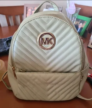 Mochila con un diseño acolchado en chevron, color verde claro o caqui claro y detalles dorados. - Compartimento principal con cierre de cremallera. - Bolsillo frontal con cremallera, varios compartimentos dentro y fuera. - Detalles metálicos dorados en la parte frontal. - Asas ajustables, usada solo una vez, está nueva.