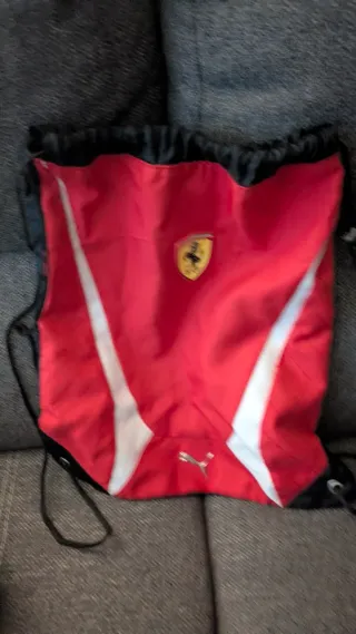 Mochila deportiva con el icónico escudo de Ferrari y el logo de Puma. - Diseño en color rojo con detalles blancos. - Cierre de cordón. - Ideal para llevar tus pertenencias.