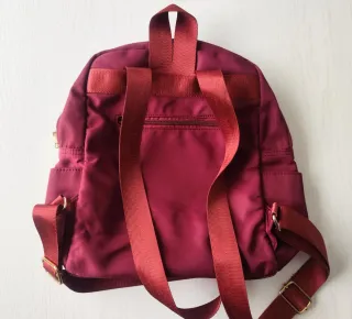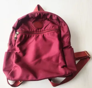Mochila pequeña en color burdeos. - Compartimento principal con cremallera. - Correas ajustables.