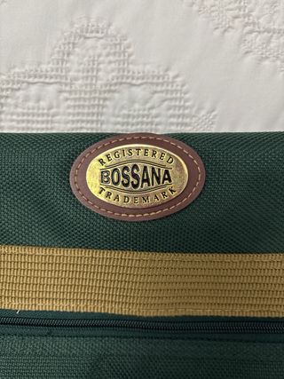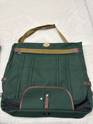 Portatrajes de la marca Rossana, ideal para llevar tu ropa de forma organizada y protegida. - Diseño elegante en tonos verde y marrón. - Correa ajustable para mayor comodidad.