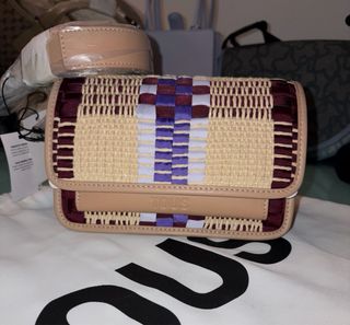 Bolso de mano Tous con un diseño tejido y detalles en piel. - Tejido principal en rafia. - Ribetes y solapa en piel. - Combinación de colores beige, morado y azul.