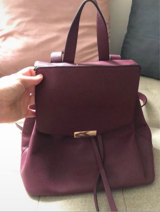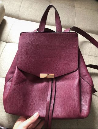 Mochila de color burdeos con un diseño elegante y práctico. - Cierre principal con solapa y broche. - Cordón ajustable en la parte superior. - Asa de mano y correas para la espalda. - Material con textura.