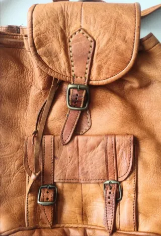 Mochila de cuero con un diseño clásico y práctico. La piel tiene alguna mancha oscura. - Material: Cuero genuino. - Cierre principal con cordón y solapa. - Bolsillo frontal con cierre de hebilla. - Correas ajustables para los hombros.