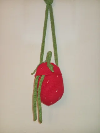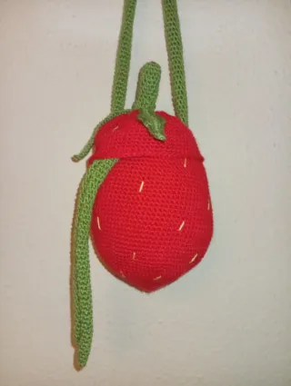 Bolso pequeño con forma de fresa, tejido a mano con crochet. - Diseño de fresa. - Cierre superior. - Asa larga para colgar.