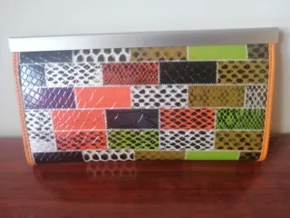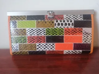 Cartera con un diseño patchwork vibrante y llamativo. - Acabado exterior con efecto piel de serpiente. - Detalle de costuras blancas. - Borde exterior en color naranja.