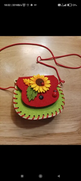 Adorable bolsito hecho a mano, perfecto para las más pequeñas. Diseñado con un encantador motivo de girasol y mariquitas. - Cierre de solapa. - Adornos de fieltro. - Asa de cordón rojo.
