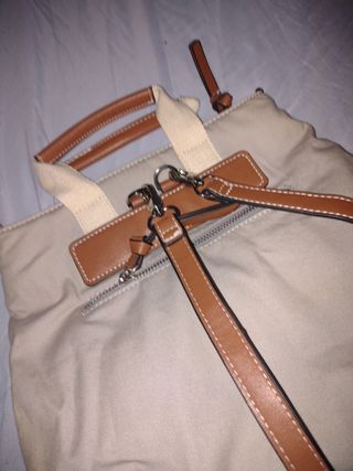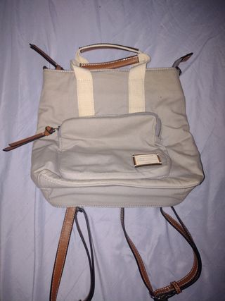 Preciosa mochila pequeña, ideal para el día a día. Es de color beige y tiene un diseño discreto y elegante. - Tiene múltiples compartimentos con cremalleras. - Las correas son ajustables. - Está en muy buen estado. - Lo unico malo esque la cremallera de alante no funciona, se puede arreglar.