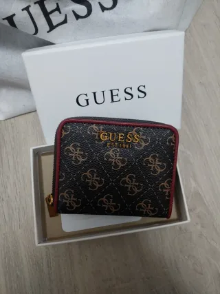 Monedero de la marca Guess con un diseño elegante. - Estampado de monograma. - Ribete en color burdeos. - Cierre de cremallera. Conservado en su caja original.