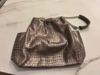 Elegante bolso o cartera con un acabado metalizado. Su diseño texturizado le da un toque único. - Material: Piel de vacuno con textura. - Cierre: Cadena metálica. - Asa: Cadena y detalle de piel.