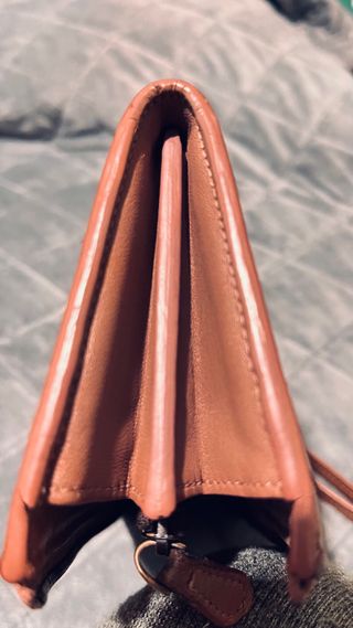 Elegante cartera de mujer con diseño tejido. Original, tiene su código. Bastante usado. - Material de cuero. - Cierre de cremallera. - Incluye correa de mano.