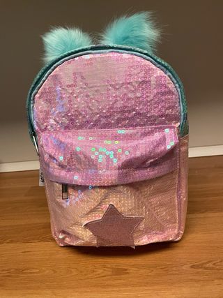 Mochila con un diseño divertido y brillante, perfecta para añadir un toque de color. Para el colegio o material de extraescolares - Adornada con lentejuelas reversibles. - Detalle de orejas en la parte superior. - Estrella decorativa en la parte frontal. Ideal para regalo de cumpleaños