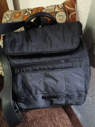 Bolso tipo mochila de la marca Desigual, modelo Voyager. - Combinación de colores negro y verde oliva. - Diseño con múltiples bolsillos y compartimentos. - Cierre principal con cremallera. - Asas de mano y correa ajustable para llevar al hombro o cruzado.