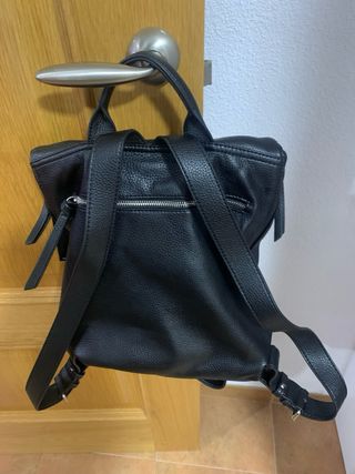 Mochila de polipiel negra con un diseño moderno y práctico. - Cierre principal con cremallera. - Bolsillo frontal con solapa y tachuelas. - Bolsillos laterales. - Correas ajustables.