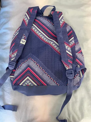 Mochila con un diseño vibrante y juvenil. - Estampado geométrico en tonos azules, rosas y blancos. - Bolsillo frontal con cierre de cremallera. - Pequeño parche circular con el logo de la marca.
