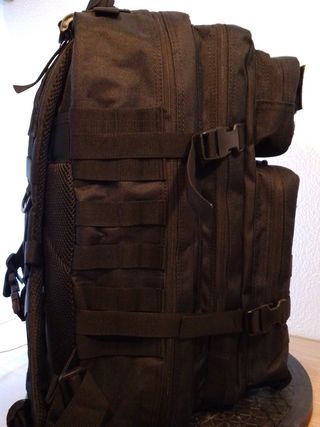 Dispongo de más parches y accesorios como mosquetones y llaveros para personalizar. Pídeme más fotos por whatsapp que aquí no caben más. Mochila de estilo táctico militar en color beige. Cuenta con múltiples compartimentos y correas para organizar tu equipo. - Color: Beige/Marrón caqui - Capacidad: 45L