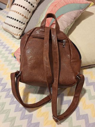 Mochila de la marca Parfois con un diseño étnico y llamativo. - Combinación de tonos marrones y multicolor. - Cierre de cordón y solapa. - Bolsillo interior con cremallera.
