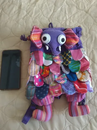 Adorable mochila con forma de elefante, perfecta para los más pequeños. Su diseño colorido y divertido la hace única. - Hecha de tela suave y resistente. - Detalles bordados y aplicaciones de patchwork. - Correas ajustables para mayor comodidad.