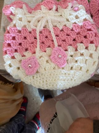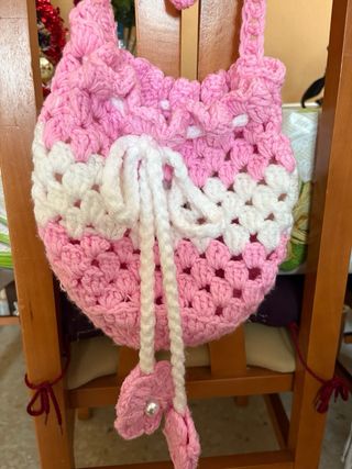 Bolso de mano o mochila con un diseño tejido en crochet, combinando tonos rosas y blancos. Presenta un cierre de cordón y dos pequeñas aplicaciones de flores. - Tejido a mano en crochet. - Cierre con cordón. - Adornos de flores. - previo al privado