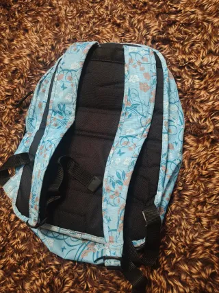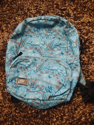 Mochila de tela con un bonito estampado floral en tonos azules y blancos. - Diseño con flores y hojas. - Cierre de cremallera. - Bolsillo frontal. - Tiene algún pequeño desteñido en el interior de los bolsillos.