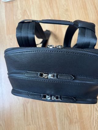 Mochila negra con varios bolsillos. Tiene rozadura