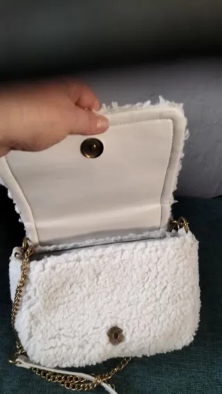 Bolso de mano con un diseño moderno y original, perfecto para darle un toque especial a tu look. - Material exterior de pelo sintético blanco. - Cadena dorada para llevar al hombro o cruzado. - Asa superior para llevar en la mano.