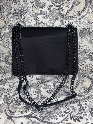 Elegante bolso negro con diseño acolchado y detalle de cadena. - Acabado mate. - Cierre de solapa. - Correa de cadena metálica.