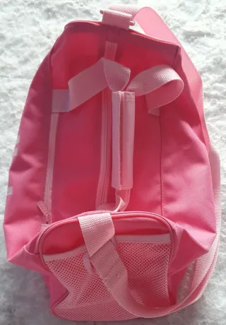 Práctica bolsa de deporte Adidas en color rosa. Ideal para llevar tus cosas al gimnasio o para viajes cortos. - Logo de Adidas en blanco. - Asa de mano y correa ajustable para el hombro. - Bolsillo lateral de malla. -Práctico bolsillo exterior con cremallera.