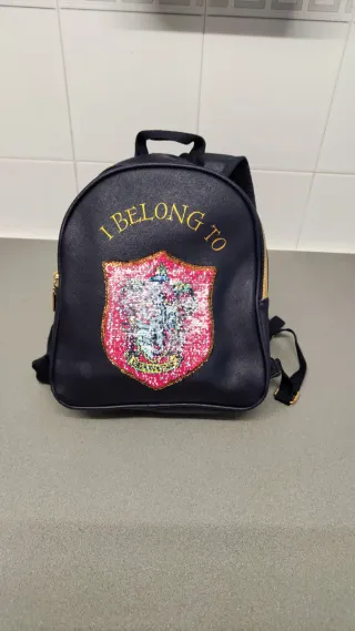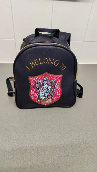 Mochila infantil con diseño reversible de Harry Potter. Presenta un escudo con detalles brillantes y el texto I BELONG TO bordado. - Diseño reversible. - Escudo con lentejuelas de las 4 casas. - Dos cremalleras. - Como nueva.