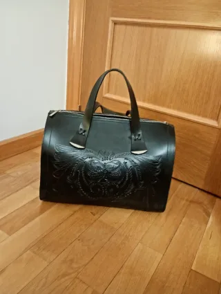 Bolso grande de piel con un diseño grabado. - Material: Piel. - Color: Negro. - Cierre de cremallera. - Dos asas superiores.