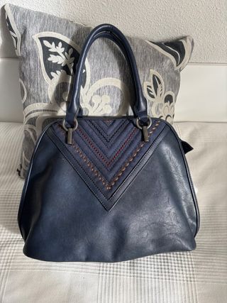 Bolso de mano en tono azul con detalles de costura en zigzag. - Asa de mano. - Correa de hombro desmontable. - Cierre de cremallera.