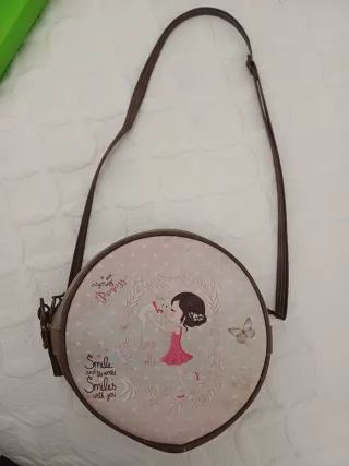 Bolso redondo con un bonito diseño infantil. Presenta una ilustración de una niña con un perrito y detalles florales. - Cierre de cremallera. - Correa ajustable. - Diseño con mariposa