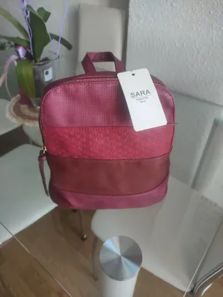 Mochila de la marca SARA con un diseño moderno y juvenil. - Combinación de tonos rosas y rojos. - Acabado con textura perforada en la parte superior. - Panel central con textura diferente. - Base en tono burdeos.